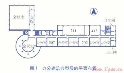 選擇4個(gè)房間(位置見(jiàn)圖l)進(jìn)行室內(nèi)熱環(huán)境監(jiān)測(cè),被測(cè)房間分別為:南向202、507房間,建筑面積均為64m2;北向211、413房間,建筑面積分別為124、64m2。規(guī)定507房間不開(kāi)啟風(fēng)機(jī)盤(pán)管,其他房間均可開(kāi)啟風(fēng)機(jī)盤(pán)管供暖。