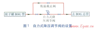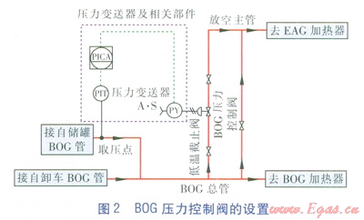 BOG壓力控制閥為氣動式薄膜凋節(jié)閥,設置于自力式降壓調節(jié)閥后、BOG總管的支管路上,進口與BOG總管連接,出口與放空主管連接,取壓點設置在BOG壓力控制閥前儲罐BOG管上,當取壓點壓力達到設定值時,閥門開啟,實現(xiàn)少量放散。BOG壓力控制閥的設置見圖2(圖2中EAG指安全放散氣體)。