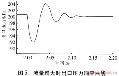 調(diào)壓器在穩(wěn)定狀態(tài)運(yùn)行2.00s時(shí)突然增大閥門開度,流量突然增大,出口壓力和閥芯位移動(dòng)態(tài)響應(yīng)曲線見圖5、6。