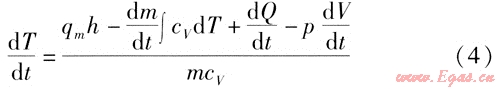 容積模型是一個(gè)開式系統(tǒng)模型,根據(jù)熱力學(xué)第一定律計(jì)算容積內(nèi)溫度、壓力和氣體質(zhì)量的變化[5]。此模型應(yīng)用于調(diào)壓器模型的高壓腔、低壓腔和控制腔,模型為: