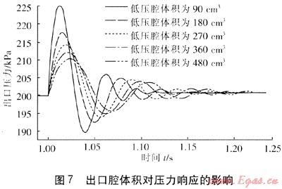 低壓腔體積分別為90、180、270、360和480cm3時(shí),在t=1.00s時(shí)刻突然減小閥門開度,流量突然減小,出口壓力的動(dòng)態(tài)響應(yīng)曲線見圖7。可以看到,在一定范圍內(nèi),隨著低壓腔體積的增加,超調(diào)量逐漸減小,而對(duì)過渡時(shí)間的影響不大。