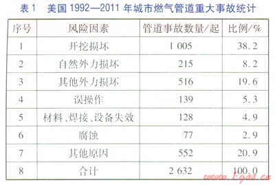 通過(guò)分析城市燃?xì)夤艿朗鹿式y(tǒng)計(jì)數(shù)據(jù),將管道面臨的風(fēng)險(xiǎn)因素分為7個(gè)大類,從管道事故發(fā)生可能性和管道事故后果兩個(gè)方面進(jìn)行分析。以1992—2011年美國(guó)的燃?xì)夤艿朗鹿蕯?shù)據(jù)為基礎(chǔ),確定了7類風(fēng)險(xiǎn)因素的風(fēng)險(xiǎn)等級(jí)排序。城市燃?xì)夤艿老到y(tǒng)風(fēng)險(xiǎn)因素的等級(jí)排序依次為開挖損壞,其他原因,其他外力損壞,自然外力損壞,誤操作,材料、焊接、設(shè)備失效,腐蝕。詳細(xì)分析了7大類風(fēng)險(xiǎn)因素在城市燃?xì)夤艿廊粘_\(yùn)行管理中的表現(xiàn)形式,對(duì)于制定安全評(píng)價(jià)方法,提高安全管理水平具有積極意義。