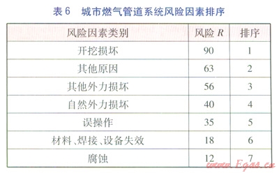 根據(jù)事故發(fā)生的可能性和后果評(píng)分結(jié)果,按照式(1)進(jìn)行計(jì)算,城市燃?xì)夤艿?/span>7類常見風(fēng)險(xiǎn)因素排序見表6。