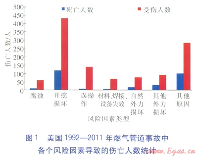 摘 要:以美國(guó)城市燃?xì)夤艿老到y(tǒng)事故統(tǒng)計(jì)數(shù)據(jù)為例,將導(dǎo)致管道事故的風(fēng)險(xiǎn)因素按照7個(gè)類型進(jìn)行分類,分析各個(gè)風(fēng)險(xiǎn)因素導(dǎo)致的管道事故數(shù)量以及產(chǎn)生的后果,對(duì)各個(gè)風(fēng)險(xiǎn)因素的風(fēng)險(xiǎn)進(jìn)行計(jì)算和排序。分析了各個(gè)風(fēng)險(xiǎn)因素在管道建設(shè)與運(yùn)行過(guò)程中的主要表現(xiàn)形式。