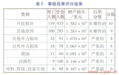 不同類型風(fēng)險(xiǎn)因素導(dǎo)致的事故類型也不相同,使得管道事故造成的后果差異也較大。例如,開挖損壞一般對(duì)管道破壞較大,會(huì)導(dǎo)致氣體大量泄漏,產(chǎn)生火災(zāi)爆炸的可能性較大;而腐蝕類型風(fēng)險(xiǎn)一般是腐蝕穿孔,泄漏孑L徑較小,產(chǎn)生的后果也較小。
