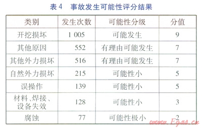 通過(guò)對(duì)城市燃?xì)夤艿老到y(tǒng)風(fēng)險(xiǎn)因素的分析可知,開挖損壞導(dǎo)致的管道風(fēng)險(xiǎn)最高,其次為其他原因和其他外力損壞。