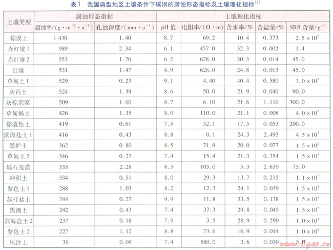 埋地鋼質(zhì)燃氣管道的腐蝕形態(tài)分為全面腐蝕、局部腐蝕兩類,全面腐蝕是指與土壤相接觸的管道表面均因腐蝕而受到損耗,以腐蝕率表示;局部腐蝕是指腐蝕的發(fā)生局限在結(jié)構(gòu)特定區(qū)域或部位上,以孔蝕深度進行評價。本文給出的我國典型地區(qū)土壤對碳鋼的腐蝕形態(tài)指標(biāo)及土壤理化指標(biāo),來自埋沒于國內(nèi)20個典型地區(qū)土壤的碳鋼試驗件1a的腐蝕數(shù)據(jù)及土壤理化性質(zhì),實測數(shù)據(jù)與實際情況接近。
