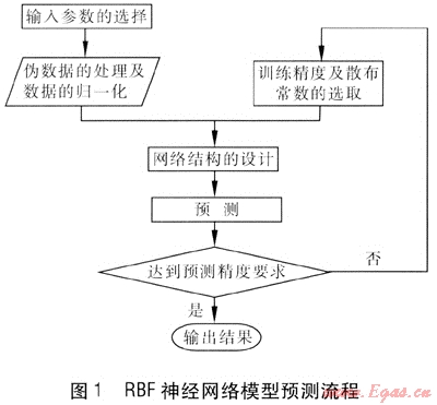 RBF網(wǎng)絡(luò)和普通的前向網(wǎng)絡(luò)有所不同,隱層神經(jīng)元是徑向基神經(jīng)元而不是tansig或者logsig神經(jīng)元。普通前向網(wǎng)絡(luò)中sigmoid神經(jīng)元能夠覆蓋較大的輸入?yún)^(qū)域,但是普通前向神經(jīng)元數(shù)目在訓(xùn)練前就已經(jīng)固定下來。而徑向基神經(jīng)元雖然只對相對較小的區(qū)域產(chǎn)生響應(yīng),但是在輸入?yún)^(qū)間較大時,可以適當?shù)卦黾訌较蚧窠?jīng)元來調(diào)整網(wǎng)絡(luò),從而達到精度要求。且RBF網(wǎng)絡(luò)的設(shè)計比普通前向網(wǎng)絡(luò)訓(xùn)練要省時得多[6]。RBF網(wǎng)絡(luò)模型預(yù)測流程見圖1。