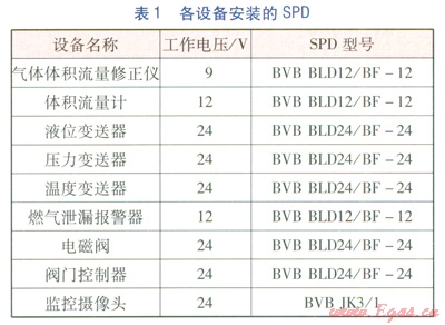 ①利用SPD將設(shè)備各端口的對(duì)地電位限制在設(shè)備能承受的范圍內(nèi),同時(shí)將各端口的感應(yīng)過(guò)電壓、過(guò)電流泄放到地,實(shí)現(xiàn)對(duì)設(shè)備的保護(hù)。安裝在室外的設(shè)備在各進(jìn)出線端安裝SPD,SPD需安裝于防水防爆屏蔽箱內(nèi)。該措施解決了上述隱患①~⑥。具體各設(shè)備安裝的SPD見(jiàn)表1。