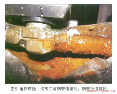 在金屬活動(dòng)順序表中,Fe要比Cu活潑,在相同的環(huán)境中,Fe的電位要比Cu負(fù)。當(dāng)異種金屬相接觸,處于相互連通的電解質(zhì)中時(shí),由于不同金屬之間存在實(shí)際電位差而使電位較低的金屬腐蝕速度比原來增大,電位較高的金屬的腐蝕速度減小,這種現(xiàn)象稱為電偶腐蝕[4],見圖5所示。當(dāng)鋼與銅相互接觸時(shí),鋼的腐蝕速率比其單獨(dú)存在時(shí)加大。在閥門位置,利用銅包鋼或者銅網(wǎng)進(jìn)行接地時(shí),由于電偶腐蝕的作用,會(huì)加速閥門的腐蝕。同時(shí)由于銅的良好導(dǎo)電性和自腐蝕較低的特性,利用銅材質(zhì)進(jìn)行接地時(shí),接觸電阻要比閥門直接接地更低,在這種情況下,陰極保護(hù)電流集中流入流出的現(xiàn)象會(huì)更加嚴(yán)重。