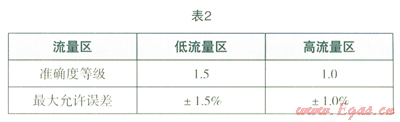 (3)取高、低流量區(qū)中示值誤差絕對值最大的值作為加氣機的示值誤差。準確度等級應(yīng)符合表2要求。