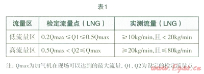 根據(jù)加氣機工作流程,按照加氣機在現(xiàn)場可以達到的最大流量Qmax分為兩個流量區(qū),其檢定流量區(qū)(LNG)Q1、Q2的設(shè)定以及實測流量(LNG)見表l的要求。表2為加氣機準確度等級及對應(yīng)的最大允許的誤差。