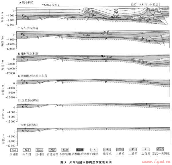 庫車坳陷構(gòu)造變形主要發(fā)生在新近系以后,康村組沉積后構(gòu)造活動開始活躍,庫車組中期構(gòu)造活動最為強烈,持續(xù)至現(xiàn)今仍在活動。古近系沉積前,中生界地層受古隆起構(gòu)造控制,呈現(xiàn)南薄北厚的楔形體,晚白堊世發(fā)生區(qū)域隆升作用,并沒有發(fā)育明顯的斷裂。古近系-新近系康村組沉積前主要是坳陷發(fā)育階段,構(gòu)造活動較弱。從圈閉形成與改造角度考慮,庫車坳陷構(gòu)造演化可劃分為以下3個主要階段(圖3):