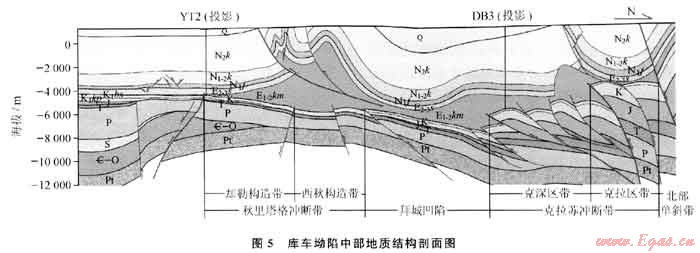 克深區(qū)帶是克拉蘇構(gòu)造帶的又一個次級構(gòu)造單元,呈NEE向條帶狀展布,東西長約190km,南北最寬約17km。北側(cè)以克拉蘇斷裂為邊界,位于克拉區(qū)帶的下盤;南側(cè)以拜城斷裂為界,與拜城凹陷相接。拜城斷裂是克拉蘇構(gòu)造帶的南邊界斷裂,規(guī)模、性質(zhì)、斷開層位與克拉蘇斷裂相同。與克拉蘇斷裂相比,拜城斷裂斷距變小,最大垂直斷距約為2000m,斷面較緩,該斷裂控制克深區(qū)帶的南邊界。克深區(qū)帶還發(fā)育多條與克拉蘇斷裂、拜城斷裂近于平行的次級斷裂,斷裂性質(zhì)與兩邊界斷裂相似,規(guī)模相對較小,多條次級斷裂與2條邊界斷裂共同決定了克深區(qū)帶的構(gòu)造樣式(圖4、5)。