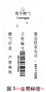 依據(jù)立管管徑的不同,使用不同規(guī)格的立管標簽。標簽上含有燃氣公司服務熱線、立管編碼的條形碼、燃氣公司信息、警示語等。目前公司已在轄區(qū)的居民小區(qū)內(nèi)試用,先將各立管信息打印于立管標簽,再將立管標簽粘貼于立管上。