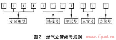 為了更好地對立管進行管理,對立管進行有規(guī)則的編號顯得非常必要。編號可與客服管理系統(tǒng)相結合,公司依據(jù)客服管理系統(tǒng)以及立管情況進行編號。燃氣立管編號規(guī)則見圖2。