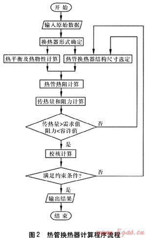 熱管換熱器計算程序主要分為以下模塊:已知傳熱量和一側(cè)溫度,求另一側(cè)溫度的迭代計算;各種翅片效率的解析計算;流體及工質(zhì)物性的數(shù)據(jù)庫查詢;熱平衡計算;各種結(jié)構(gòu)的傳熱量計算;阻力計算;結(jié)構(gòu)參數(shù)的確定;校核計算;結(jié)果保存及報表生成;AutoCAD出圖。