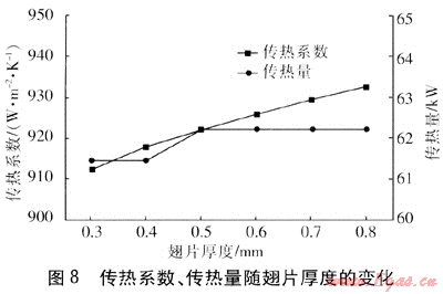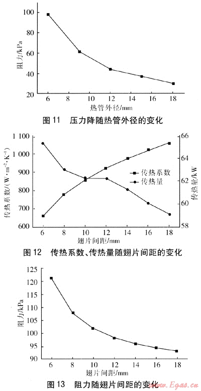 可以看出,翅片厚度對熱管的傳熱系數(shù)和傳熱量影響很小,但對阻力影響影響較大。翅片越薄,流動阻力越小。因此,應(yīng)盡可能選擇較薄的翅片。但翅片厚度的選取還要從機械強度、制造工藝以及耐腐蝕等方面進行考慮。