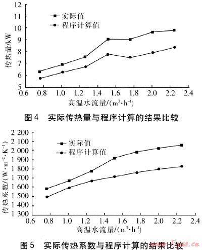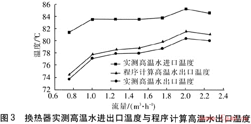 換熱器高溫水進出口溫度與程序計算高溫水出口溫度見圖3。由圖3可知,當(dāng)高溫水流量在0.75~2.25m3/h變化時,實測的高溫水出口溫度與程序計算值的變化趨勢基本是一致的,但實測值比程序計算值低,即換熱器的實際傳熱量比程序計算的高。