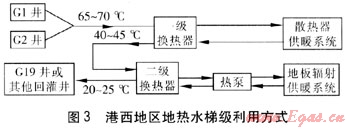 ① 港西地區(qū)新建建筑首選地?zé)崴?。目前,港西地區(qū)G1、G2、G19井待用,地?zé)崴捎锰菁?jí)利用方式。港西地區(qū)地?zé)崴菁?jí)利用方式見圖3。采用溫度為65~70℃的G1、G2井地?zé)崴?jīng)一級(jí)換熱器加熱散熱器供暖系統(tǒng)供水,地?zé)崴疁囟冉抵?0~45℃。然后經(jīng)二級(jí)換熱器為熱泵提供熱量,熱泵制取熱水后供地板輻射供暖系統(tǒng)。尾水溫度為20~25℃,回灌到G19井或其他回灌井。