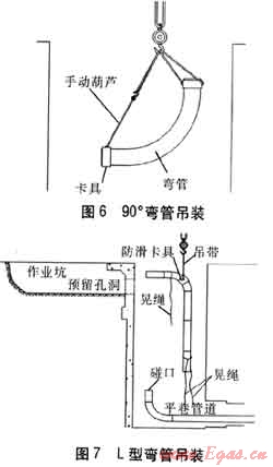 彎管在豎井預制管吊裝前先行吊裝。吊裝時,為了保證下部焊口基本垂直,采用圖6所示的吊裝方式,通過調(diào)整手動葫蘆的長度來控制彎頭狀態(tài)。