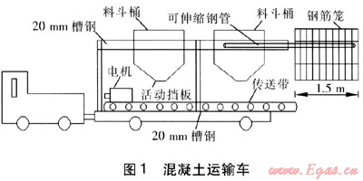 根據(jù)隧道的內(nèi)徑大小,現(xiàn)場制作混凝土運輸車,見圖1。受電機車的運載能力和空間限制,運輸車一次可運輸4m3的混凝土,可澆筑墊層長度為3m;可同時運輸鋼筋籠、預埋件和混凝土,在運輸鋼筋籠時伸長可伸縮鋼管,將鋼筋籠掛在上面,鋼筋籠的長度為1.5m,將預埋件固定在裝滿混凝土的料斗桶內(nèi)。混凝土的垂直運輸采用起重量為100kN的龍門吊,吊筒采用漏斗型開閉式,容積為1.5~2.0m3。混凝土在隧道內(nèi)的水平運輸采用牽引力為150kN的軌道電機車牽引一臺混凝土運輸車。