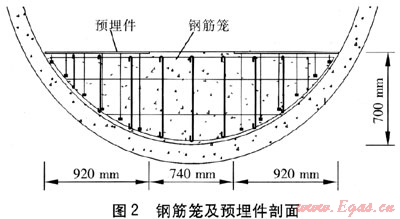 由隧道接收井處向始發(fā)井處進行澆筑。當混凝土運輸車行駛到待澆筑位置時,啟動傳送帶上的電機,打開料斗桶下方的活動擋板,混凝土依靠自重下落到傳送帶上,輸送至待澆筑位置?;炷翝仓r,為保證施工的順利進行,需在待澆筑混凝土的正上方設置鋼支架跳板,跳板需距離混凝土成型面有一定的距離,以保證混凝土正常成型。隧道內(nèi)的混凝土運輸時間較長,利用混凝土運輸?shù)臅r間進行軌道拆除。軌道每段長6m,將拆除的軌道吊掛在隧道壁上。在澆筑混凝土過程中,將預制好的鋼筋籠和預埋件安裝好,保證預埋件上表面水平,且和墊層處于同一水平面,澆筑時要嚴格按照施工規(guī)范進行振搗?;炷翝仓瓿桑谑諠{后應進行養(yǎng)護。養(yǎng)護期間覆蓋保溫,并保持濕潤,覆蓋時注意不得損傷和污染混凝土表面。在混凝土上面漫鋪草袋,進行灑水養(yǎng)護[2]。鋼筋籠及預埋件剖面見圖2。