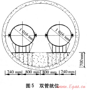 某工程盾構(gòu)隧道長1400m,隧道斷面為圓形,內(nèi)徑為3.08m,始發(fā)井為直徑為12m、深25m的圓柱形豎井,接收井為直徑為12m、深15m的圓柱形豎井。根據(jù)設計要求,圓柱形隧道底部澆筑高700mm的混凝土墊層,墊層上并行敷設兩條外徑為1016mm的管道。管道全部安裝在滑動支架上,每隔12m設置1個滑動支架,滑動支架滿足承重和抗浮的要求。