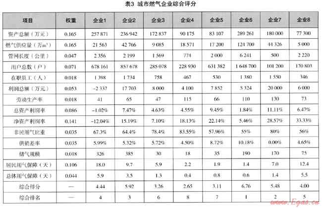 根據(jù)已經(jīng)建立的評價體系,我們對國內(nèi)12家運營較規(guī)范燃氣企業(yè)進行了調研,并從中選擇數(shù)據(jù)反饋完整的8家企業(yè)進行比較。根據(jù)8家企業(yè)經(jīng)營指標(截止至2010年底)的相對優(yōu)劣,分別計算每個企業(yè)每個項目得分(0分-10分),各項加權匯總后為企業(yè)綜合得分。(見表3)