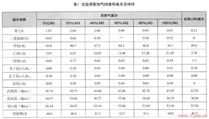 按照上述方案配制的LNG以不同比例(0、20%、40%、60%、80%、100%)與實(shí)驗(yàn)室管輸氣摻混即可模擬真實(shí)情況下用戶處的氣源組分。配氣裝置見圖1,配氣時(shí)采取西氣-乙烷-氮?dú)舛啻谓惶孢M(jìn)入的方式,盡可能保證均勻。監(jiān)測(cè)膜式燃?xì)獗硖幍娜細(xì)鉁囟龋员阌谶M(jìn)氣量的修正。配氣的目標(biāo)原則是華白數(shù)與目標(biāo)氣一致,燃燒勢(shì)盡可能接近。表1給出了實(shí)驗(yàn)室配制的測(cè)試用氣組分及特性,以LNG比例作為標(biāo)識(shí)。作為對(duì)比,同時(shí)給出了LNG的實(shí)際組分。