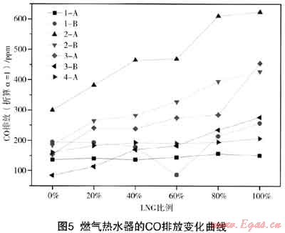 圖5為LNG比例對(duì)熱水器C0排放的影響。隨著LNG比例的增加,熱水器的C0值呈現(xiàn)增大趨勢(shì)。
