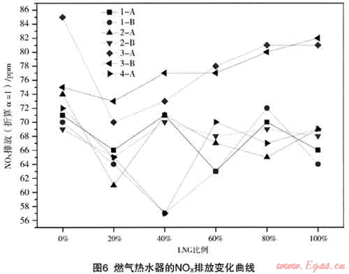 圖6為LNG比例對(duì)熱水器N0x排放的影響。N0x排放隨LNG比例的增加呈現(xiàn)無規(guī)律的變化趨勢(shì),但基本穩(wěn)定在50×10-6~80×10-6之間。由于熱水器的燃燒室體積較小,相對(duì)散熱強(qiáng)烈[4],燃燒室內(nèi)溫度較低,N0x生成量很小。