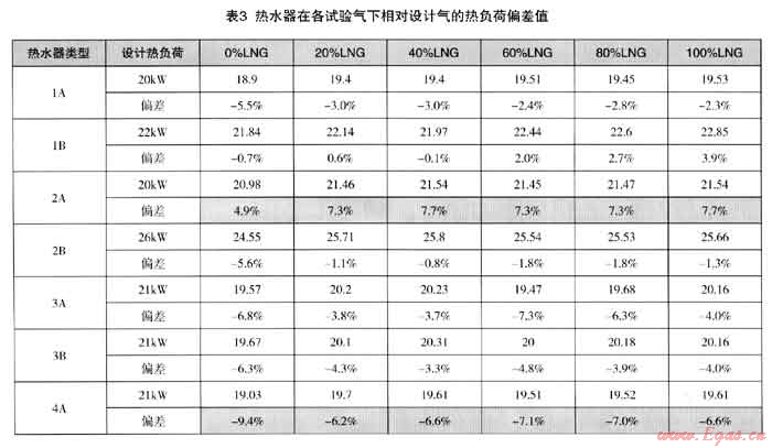 比較各型號(hào)熱水器在設(shè)計(jì)氣下的熱負(fù)荷,得出在氣源從100%管輸氣變化到100%LNG時(shí)每種熱水器的熱負(fù)荷偏差值。表巾熱負(fù)荷偏差較大者用棕色底紋標(biāo)識(shí)出。可知熱水器2-A與4-A在氣源變化時(shí)會(huì)發(fā)生比較明顯的響應(yīng),可能導(dǎo)致用戶處的不滿。