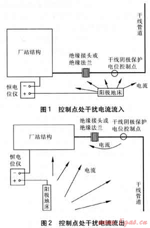 站內(nèi)陰極保護(hù)電流一般通過影響站外干線陰極保護(hù)系統(tǒng)控制點(diǎn)來對其造成干擾。由于國內(nèi)大多數(shù)干線管道陰極保護(hù)系統(tǒng)采用恒電位控制方式,而電位信號(hào)反饋點(diǎn)即陰極保護(hù)電位控制點(diǎn)通常距離站內(nèi)金屬結(jié)構(gòu)較近,因此易受到站內(nèi)陰極保護(hù)系統(tǒng)的影響,引起極化增加或去極化而影響控制系統(tǒng)的信號(hào)反饋,從而使干線保護(hù)系統(tǒng)的輸出電流降低或增加,干線陰極保護(hù)水平相應(yīng)受到影響。通常干擾有兩種類型:一是控制點(diǎn)處有干擾電流流入,導(dǎo)致極化增加,見圖1,為維持設(shè)定的控制電位,干線陰極保護(hù)系統(tǒng)輸出電流將自動(dòng)下降,導(dǎo)致整個(gè)管道陰極極化程度降低,遠(yuǎn)端易保護(hù)不足;二是控制點(diǎn)處有干擾電流流出,導(dǎo)致極化減小,見圖2,為維持設(shè)定的控制電位,干線陰極保護(hù)系統(tǒng)輸出電流將自動(dòng)提高,導(dǎo)致整個(gè)管道陰極極化加大,近端易產(chǎn)生過保護(hù)。