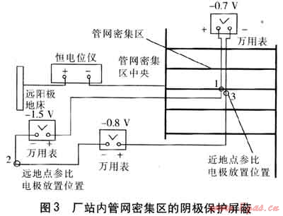 圖3顯示了廠站陰極保護(hù)中管網(wǎng)密集區(qū)的屏蔽現(xiàn)象。1為管網(wǎng)密集區(qū)中央位置,2為遠(yuǎn)地點(diǎn)參比電極放置位置,3為近地點(diǎn)參比電極放置位置?,F(xiàn)場測量得到,管網(wǎng)密集區(qū)中央相對于近參比電極的電位即1、3之間的電位差僅為-0.7V,達(dá)不到-0.85V的保護(hù)電位要求;而2、3之間的大地電位差達(dá)到-0.8V,說明電流在土壤中流動(dòng)產(chǎn)生較大的電位梯度,同時(shí)管網(wǎng)密集區(qū)外圍接近保護(hù)要求,說明管網(wǎng)密集區(qū)外圍的管道吸收了大部分保護(hù)電流,導(dǎo)致中央管道得不到足夠的保護(hù)電流,從而造成了屏蔽。