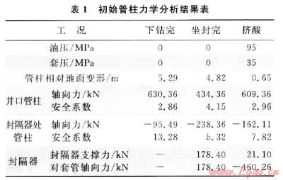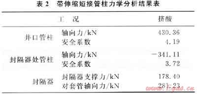 通過(guò)以上敏感性分析,設(shè)計(jì)1.7m伸縮短接便可有效補(bǔ)償擠酸工況管柱變形附加力。以下對(duì)安裝伸縮短接后的管柱進(jìn)行力學(xué)分析和強(qiáng)度校核,結(jié)果見(jiàn)表2。
