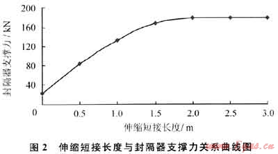 封隔器安全坐封力為9.07t,而壓裂時(shí)坐封力為21.1kN,小于封隔器安全坐封力,同時(shí)封隔器對(duì)套管作用力達(dá)460.26kN。元壩2井事故分析結(jié)果為:施工中封隔器承受上頂力較大,膠皮密封不嚴(yán),存在柒性竄漏,同以上理論計(jì)算結(jié)果相符合。因此,采用本研究方法設(shè)計(jì)伸縮短接,針對(duì)管柱受力最惡劣的擠酸工況,采用不同伸縮短接長(zhǎng)度對(duì)封隔器支撐力進(jìn)行敏感性分析,分析結(jié)果如圖2所示。