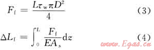 對(duì)于帶封隔器井下管柱,隨著井筒壓力、溫度等參數(shù)變化而產(chǎn)生溫度效應(yīng)、活塞效應(yīng)、鼓脹效應(yīng)、螺旋彎曲效應(yīng)。對(duì)這4個(gè)基本效應(yīng)產(chǎn)生的管柱變形及其變形力,國(guó)內(nèi)外學(xué)者已經(jīng)做了大量研究,此不贅述。對(duì)于深層氣井,高速擠酸過(guò)程中,流體粘滯摩阻效應(yīng)是引起管柱變形的重要因素,也是造成管柱、封隔器失效的主要原因。因此,在分析管柱變形時(shí)除了要考慮上述4種基本效應(yīng)外,還必須考慮流體粘滯摩阻效應(yīng),粘滯摩阻力(Ff)和摩阻效應(yīng)變形(△Lf)分別由下式表示[7~8]: