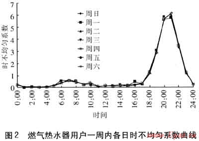 隨著我國經(jīng)濟(jì)的迅速發(fā)展以及人民生活水平日益提高,人們在日常生活中對天然氣的需求持續(xù)增長。天然氣負(fù)荷指標(biāo)和用氣規(guī)律的研究,對城市燃?xì)庖?guī)劃、設(shè)計(jì)、調(diào)度等具有重要指導(dǎo)意義,近年來受到廣泛關(guān)注[1~16]。筆者于2010年6月至8月對北京市燃?xì)鉄崴饔脩暨M(jìn)行調(diào)查,由于燃?xì)鉄崴髦饕糜谙丛?,因此在調(diào)查中著重獲取居民夏季一周內(nèi)各日的洗澡時(shí)間、洗澡耗時(shí),并由此計(jì)算燃?xì)鉄崴饔脷饬?,獲得時(shí)不均勻系數(shù)。以一周為變化周期,分析北京市燃?xì)鉄崴鞯挠脷饬考皶r(shí)不均勻性。