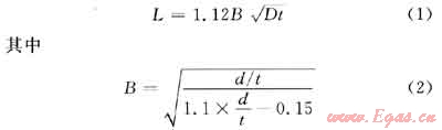 當(dāng)腐蝕深度比大于管道壁厚的10%且小于80%的鄰近腐蝕區(qū)域,腐蝕區(qū)的軸向長度不得大于由下式計(jì)算出的距離: