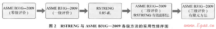 RsTRENG與AsME B31G—2009中各等級評價(jià)方法預(yù)測結(jié)果的保守性與實(shí)際操作的難易程度都不盡相同。圖2將這些評價(jià)方法按它們的保守性和可操作性進(jìn)行排序,更便于管道評估人員根據(jù)實(shí)際情況選擇適合的評價(jià)方法進(jìn)行管道剩余強(qiáng)度評價(jià)。圖2中的各級評價(jià)方法保守程度隨著箭頭逐漸降低,而操作難度則隨著箭頭逐漸增大。