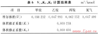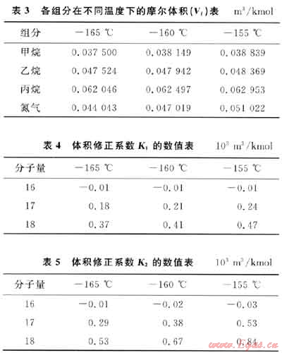 根據(jù)LNG液相平均溫度與混合物分子量(M),可以在表3~5中利用線性插值法求得相應溫度下各組分的摩爾體積(Vi)與體積修正系數(shù)(K1、K2)值,結果見表6。