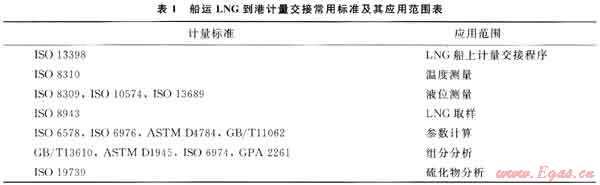 目前,全球LNG接收站(包括國內已經投入運營的廣東大鵬LNG、上海LNG和福建LNG接收站)的到港計量交接多采用IS0、ASTM、GPA等制訂的國際標準[14],常用標準及其應用范圍如表1所示。國家標準GB/T 11062、GB/T 13610等均為同等或非等效采用相應的國際標準;另外,由于國內LNG工業(yè)尚處于起步階段且LNG買賣均涉及外方,因此,相關國家標準在實際LNG到港計量交接中尚未得到廣泛的應用[15~16]。