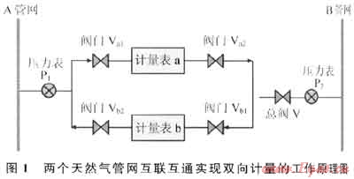 在兩個天然氣管網(wǎng)(A、B)聯(lián)通處的兩側(cè)分別設(shè)置用于測量管網(wǎng)實際運行壓力的壓力表(P1、P2),同時設(shè)置兩個方向相反的單向計量通道:A管網(wǎng)通過計量儀表a向B管網(wǎng)補充天然氣;B管網(wǎng)通過計量儀表b向A管網(wǎng)補充天然氣。