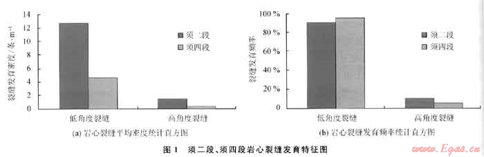 該區(qū)須家河組以發(fā)育低角度裂縫為主,發(fā)育密度大致是高角度裂縫的10倍,出現(xiàn)頻率超過90%。無論是低角度還是高角度裂縫,須二段都較須四段更自發(fā)育,其裂縫平均密度顯著大于須四段(表1、圖1)。
