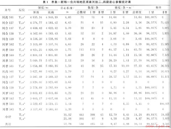 為便于統(tǒng)計將該區(qū)巖心裂縫按角度大小分為Ⅰ型、Ⅱ型兩種,工型指低角度裂縫(<45°,含水平裂縫),Ⅱ型指高角度裂縫(≥45°,含垂直裂縫)。對該區(qū)8口重點井的巖心進行了觀察,并選擇其中典型段的52.28m作了細致識別與統(tǒng)計,結(jié)果如表1所示。