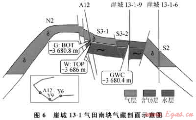 由于陵三段儲層厚,氣柱高度大,一直被認為是具統(tǒng)一氣水邊界的均一氣藏。但氣田范圍內(nèi)發(fā)育許多斷層,因斷距較小,斷層的封堵性常未引起重視。隨著十幾年的持續(xù)開發(fā),氣田的動靜儲量差別較大。在構造南塊S3-1高部位的A12井,竟然在主力氣層出現(xiàn)水層,其氣水界面高出“統(tǒng)一”氣水界面276m,令所有研究者十分困惑。通過對該井壓力資料進行分析,A12井區(qū)北側斷層Y3隨著生產(chǎn)壓力下降而開啟,開井時地層壓力系數(shù)只有0.7。為進一步挖掘與S3-1相鄰的S3-2的儲量,又鉆了Y9井,結果更令人費解,只鉆遇薄氣層及厚水層,與S3-2東側低部位的Y6井矛盾,因為Y6井無水層。經(jīng)小層對比,儲層橫向變化不大且斷層并不能斷開儲層段。