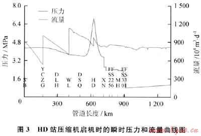 HD站壓縮機(jī)啟機(jī)時(shí)的瞬時(shí)壓力和流量趨勢(shì)如圖3所示。從圖3中可以看出,HD站壓縮機(jī)啟機(jī)后,該站的天然氣通過(guò)量瞬間提高的幅度非常大,上下游的流量上升速度均較快,入站壓力下降,出站壓力上升。長(zhǎng)此以往將影響到上游壓縮機(jī)的運(yùn)行、下游用戶的分輸量以及全線的輸氣量,最后,全線工況會(huì)穩(wěn)定到如圖1所示的狀態(tài)。
