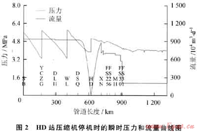 HD站壓縮機(jī)停機(jī)的瞬時(shí)壓力和流量趨勢(shì)如圖2所示。從圖2可以看出,HD站壓縮機(jī)停機(jī)后。該站的天然氣通過(guò)量瞬間下降至0,上下游的流量下降均下降較快,入站壓力上升,出站壓力下降。長(zhǎng)此以往將影響到上游壓縮機(jī)的運(yùn)行、下游用戶的分輸量以及全線的輸氣量。