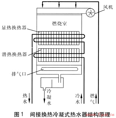 這種換熱方式采用間壁式換熱器進行換熱,高溫煙氣通過間壁式換熱器加熱水。目前國內市場上的冷凝式熱水器大多采用這種形式。其結構原理見圖1。